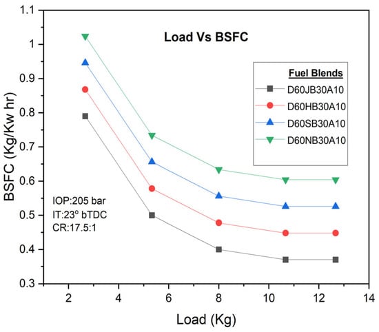 The brake-specific fuel consumption (BSFC) was found to be influenced by the association between spray and ignition characteristics of the fuel. The outcome indicates that the BSFC falls down as the engine load increases, leading to improved fuel consumption rates. However, for the D60JB30A10 fuel blend, the BSFC was found to be higher (i.e., 0.37 kg/kw h) compared to D60HB30A10 (0.448 kg/kw h), D60SB30A10 (0.526 Kg/kw h), and D60NB30A10 (0.604 kg/kw h) biodiesel blends, and the variations are presented in Figure 6. Nevertheless, it was still similar to that of pure diesel.