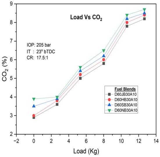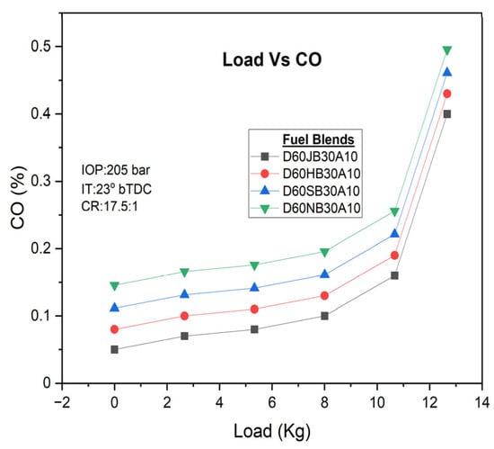 There are different engine loads for various fuel blends. Higher engine loads, especially under full load and partial load conditions, tend to produce higher CO emissions. However, the occurrence of oxygen enrichment in the D60JB30A10 blends result in lower CO emissions (i.e., 0.16 vol%) as compared to D60HB30A10 (0.19 vol%), D60SB30A10 (0.18 vol%), and D60NB30A10 (0.222 vol%) blends. The addition of hydrogen peroxide (H2O2) increases the oxygen content, facilitating better carbon oxidation and more complete ignition, thus reducing CO emissions. CO emissions with engine load for developed biodiesel blends are shown in Figure 8.