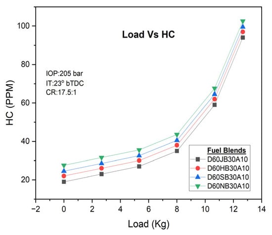 HC with Engine load for the developed biodiesel blends.