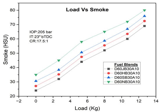 Similarly, smoke emissions also rise with higher engine loads, but the addition of H2O2 can substantially decrease smoke emissions. The D60JB30A10 blend demonstrates lower smoke emissions (i.e., 60 HSU) compared to D60HB30A10 (63.452 HSU), D60SB30A10 (66.895 HSU), and D60NB30A10 (70.012 HSU) blends. Smoke emissions with engine load for developed biodiesel blends are shown in Figure 11. The inclusion of H2O2 provides additional oxygen, which leads to the more complete breakdown of solid or liquid particles, enhancing the ignition process and contributing to a reduction in smoke emissions.