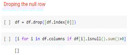Missing value check: The dataset was examined for any missing values. It was observed that all the features had one common missing value, located at the zeroth index. As a solution, the entire row containing the null value was dropped and a snippet of code has shown in Figure 13. Consequently, the shape of the dataset changed to 360 rows and 13 columns.