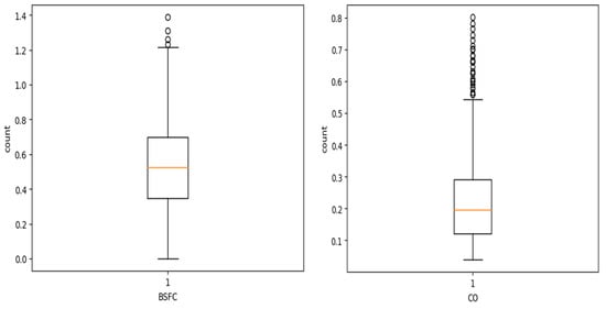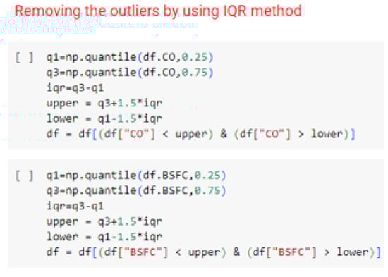 Outlier detection and removal: During univariate analysis, specifically through box plot analysis, it was visually evident that two columns, BSFC and CO, contained outliers, shown in Figure 14. Given that it is a regression problem, it is crucial to eliminate outlier values for accurate prediction of the target column. The outliers were removed using the interquartile range (IQR) method and snippet of code is shown in Figure 15.