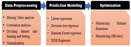 For a long time, the application of machine learning calculations has altogether moved forward execution over different areas, including data innovation [29], therapeutic applications [30], building [31], development [32], and different other spaces [33,34,35]. In the context of engine emission prediction, machine learning models have proven to be effective, and researchers have explored various techniques such as Artificial Neural Networks (ANN), Support Vector Regression (SVR), Decision Trees (DT), and Random Forest (RF) [36]. Comparisons between outfit learning strategies and SVM (support vector machine) utilizing the RMSE (Root mean square error) execution metric have uncovered that gathering strategies, for the most part, accomplish lower mistake rates.