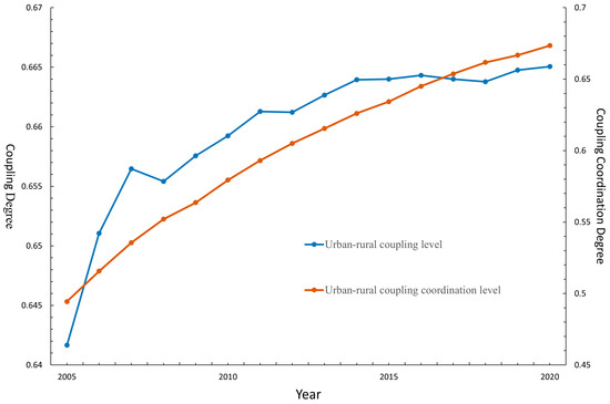 Coupling degree and coupling coordination degree of urban–rural integration.