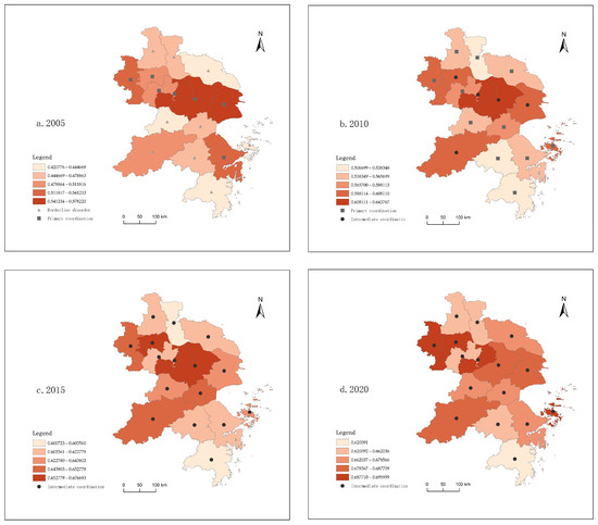 The spatial distribution maps were drawn for the years of 2005, 2010, 2015, and 2020 (Figure 5). The level of coupling coordination was classified into four hierarchical gradients from low to high, using the natural breakpoint method. Different states of coordination were represented by triangular, square, and circular icons, according to the classification criteria in Table 3. In general, the urban–rural coordination in the YRD region exhibited a relatively dispersed distribution pattern. It may be because the development of each city had certain similarities, but the mutual connections and interactions between adjacent areas had not yet reached a stable and orderly state. In addition, obstacles such as local protectionism have also made it necessary for the breaking of urban barriers and the full realization of the spillover effects of each city’s advantages to take time to achieve.