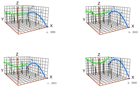 For further analysis, the geographical data of each city was used as the X and Y values of the horizontal attribute, and the coupling coordination level was used as the Z value of the height attribute. Through fitting with a second-order trend surface function, the results are shown in Figure 6, where the green curve represents the spatial fitting line in east–west orientation and the blue curve represented the fitting line in north–south orientation.