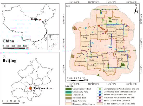 (a) Location of Beijing in China; (b) Location of the core area in Beijing; (c) Study area and distribution of subdistricts and city parks at all levels.