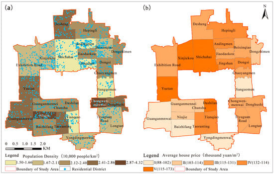 (a) Distribution of residential areas and subdistrict population density; (b) Average price of houses in each subdistrict.