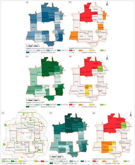 (a) Distribution of average accessibility of residential areas to urban parks by subdistrict; (b) Spatial autocorrelation analysis of socioeconomic level and accessibility of urban parks; (c) Total park area available within 1.5 km of residential areas; (d) Spatial autocorrelation analysis between socioeconomic levels and urban park area available within 1.5 km of residential areas; (e) Grading of urban park quality; (f) Mean value of park quality within 1.5 km of residential neighborhoods in each subdistrict; (g) Spatial autocorrelation analysis of socioeconomic level and park quality distribution.