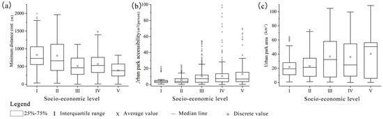 Residential areas with different economic levels. (a) Minimum distance to reach parks; (b) Urban park accessibility; (c) Total area of accessible parks within 1.5 km.