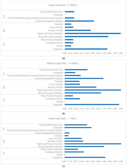 The statistical results are shown in Figure 5, with higher scores in the RE of urban parks of all sizes for sports and fitness facilities, rest and leisure facilities, and security facilities; lower scores for access facilities and amenities in large parks; and lower scores for amenities in small parks. Vegetation scored the highest in the LE dimension for all three park sizes, and animal elements were the least abundant in medium and small parks. In the CE dimension, large- and medium-sized parks had the highest scores for cultural and educational facilities, lowest scores for landmarks, highest scores for landmarks in small parks, and lowest scores for radio and television broadcasting communication coverage facilities.