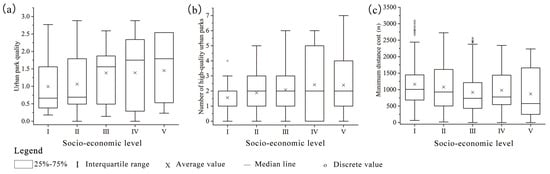 Parks within 1.5 km of residential areas with different economic levels. (a) The quality of accessible urban parks; (b) Number of high-quality parks; (c) Minimum distance to high-quality parks.
