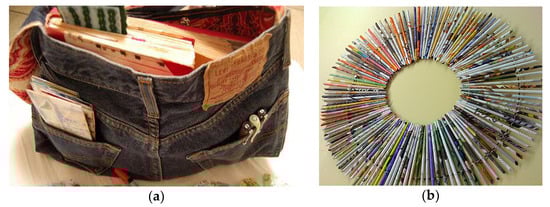 “Trash to Treasure” refers to transforming discarded or unwanted items, often considered trash or waste, into valuable or desirable products. It involves repurposing, upcycling, or creatively reusing materials typically disposed of in landfills. For instance, repurposing or upcycling trash can create distinctive and valuable products while reducing the demand for new raw materials. Various materials can be involved in the Trash to Treasure initiatives; for example, discarded wood can be transformed into stylish furniture pieces [], old fabrics can be repurposed into trendy fashion accessories (Figure 1a) [], pamphlets in the daily newspaper into decorative place mat (Figure 1b) [] or glass bottles can be turned into decorative vases or lamps [].