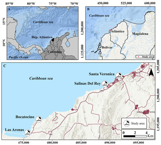 Study area. (A) Global background; (B) Regional context; and (C) Selected beaches in the Atlántico department.
