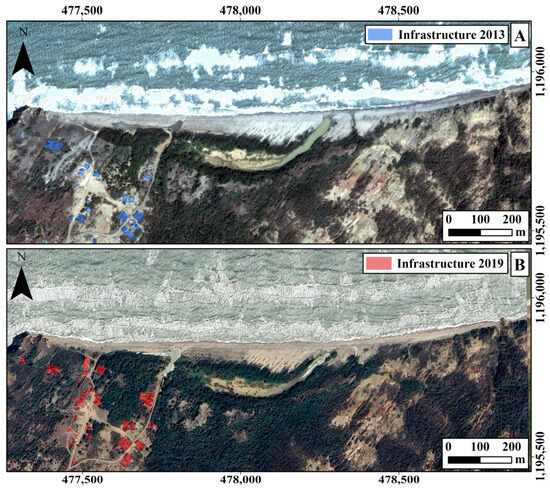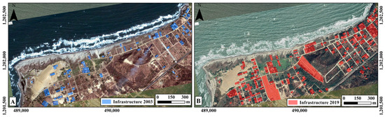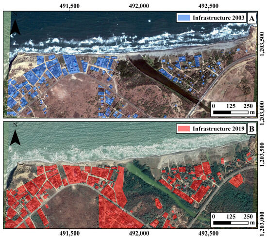 Representation of the area occupied by buildings (infrastructure) in 2003 (A) and 2019 (B) on the Santa Verónica beach.