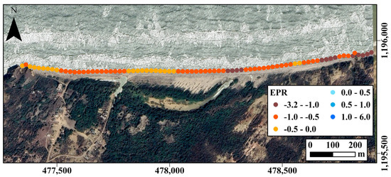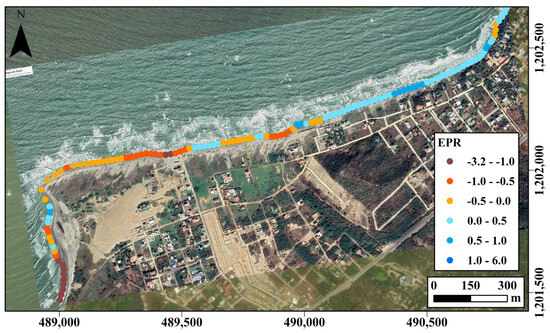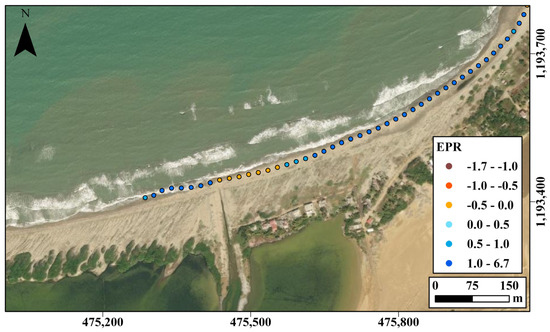 Figure 2 presents the analysis of the evolution of the coastline between 2003 and 2019 through the representation of the values of the rate of movement of the coastline (EPR-DSAS). In general, the beach of Santa Verónica presents moderate accretion, varying between 1.00 and 6.70 m/year of progradation in the analyzed period. Sectors with erosion can be identified to the west with high rates between −1.70 and −1.00 m/year.