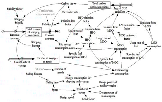 | R1 | Total revenue→Number of vessel voyages→Total energy consumption→Fuel emissions→Carbon dioxide emission→Pollution losses |