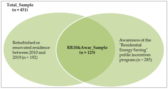 We created a dataset based on the collected data. To create the final dataset, we identified and removed the respondents who had not answered all the questions. On this basis, we should note that the question with the highest rate of missing answers was “year of construction” of the residence. As mentioned in Section 3.1, the final database included 451 responses; this dataset, including the complete responses, will be called “Total_Sample”. Furthermore, to properly examine the subject of the use of the public incentives program, a subsample was created, including only the respondents who stated that: