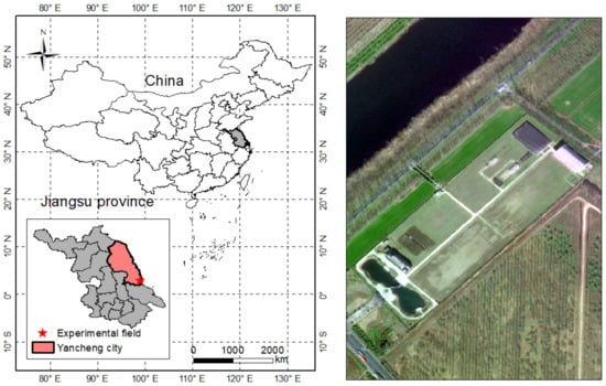 The experimental area is situated in Jianggang Town, Dongtai City, Jiangsu Province (32°51′44″ N, 120°53′47″ E), as shown in Figure 1. It falls within a typical monsoon climate zone with an average annual temperature of 14.7 °C [27]. The average annual precipitation in the area is 980–1100 mm, with uneven distribution of rainfall. Particularly during the rainy season from June to September, rainfall accounts for 40–60% of the total annual precipitation. The dry season experiences less rainfall and stronger evaporation, with a yearly evaporation rate of approximately 1200 mm, slightly exceeding the annual rainfall [27]. The topography in this area is low-lying, and the groundwater depth is shallow. The depth of the groundwater varies across seasons with a depth of 0.2–0.5 m in summer, about 1.0 m in spring and autumn, and 1.5–2.5 m in winter. The soil in the experimental area is mainly composed of coastal sandy soil, with a soil bulk density ranging from 1.40 to 1.52. Due to the comprehensive effects of factors such as the groundwater level, precipitation, layout of irrigation and drainage canals, season, and evaporation, the distribution of soil salinity is uneven. Local data indicates that the lowest and highest soil salinity levels are 0.5 g/kg and 23 g/kg, respectively, with a generally high soil salinity level classified as heavy salt soils or even extremely heavy salt soils (Table 1) [28]. The majority of unimproved land in the experimental area has salt deposits on the soil surface with salt return occurring even after artificial improvement. The basic soil parameters of the total study area in this study are presented in Table 2, and the Simple of Number 3 and Number 4 are in the experimental area. The initial salt ion content of the experimental area soil is displayed in Table 3, the testing methods for soil indicators refer to soil chemical analysis [29].