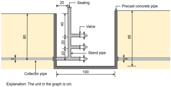 The underground drainage system had a two-stage pipe network layout consisting of converging water absorption and water collection pipes. The water absorption pipes and the water collection pipes were interconnected orthogonally and all made of PVC single-wall corrugated pipes. The inner diameter of the suction pipe was 50 mm and the inner diameter of the collecting pipe was set to 90 mm, based on the convergence. The buried depth of both pipes was 0.8 m and the ratio of the suction pipe was 1‰, while the ratio of the collecting pipe was 0.5‰. The collecting pipe entered the end of the sump and was equipped with a valve for drainage control. The drainage control measures are illustrated in Figure 3.