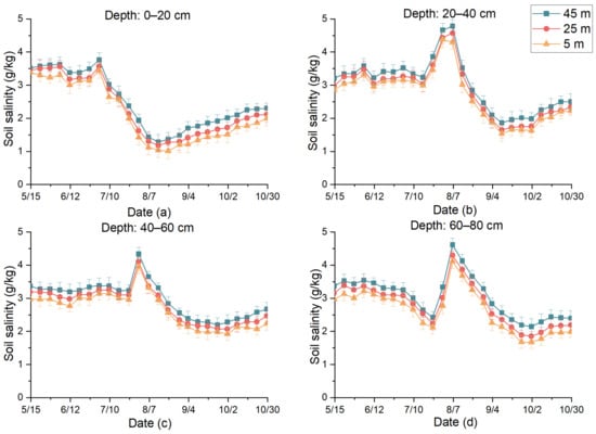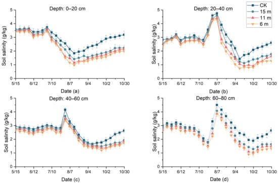 As with the fluctuations in soil salinity levels among varying subsurface drainage pipe spacing treatments, there was a comparable pattern in May–August soil salinity changes, whereby the soil salinity levels reduced significantly within the 0–20 cm soil layer (Figure 6a) while increasing to a greater extent within the deeper 20–80 cm layer (Figure 6b–d).