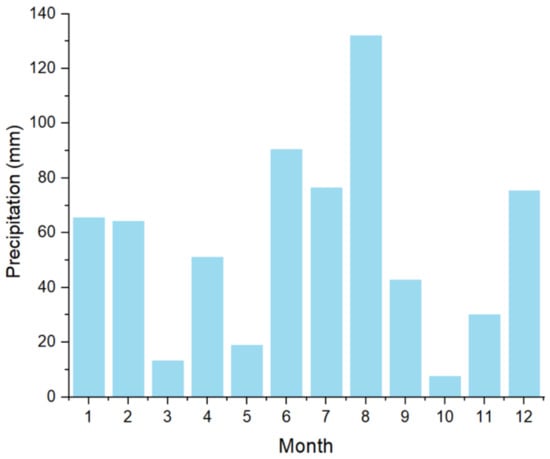 Previous research findings indicate that precipitation has an impact on leaching and desalination of soil [36]. This study investigated the monthly precipitation in the study area during the experimental period (Figure 5) and analyzed the impact of temporal variability of precipitation on soil salinity movement. It is apparent that from late May to July, soil salinity levels for all four treatments exhibited a substantial decline within the 0–20 cm soil layer (Figure 4a), while salinity levels in the deeper 20–80 cm layers remained relatively stable (Figure 4b–d). Furthermore, the differences in soil salinity levels among the three distinct subsurface drainage pipe spacing treatments were relatively minor. The results of the experiment demonstrate that in August, significant rainfall caused a decline in soil salinity within the 0–20 cm layer but a rise in salinity in the 20–80 cm layer since the salt was carried down into the deeper layers or groundwater. This resulted in a substantial reduction in surface soil salinity, which agrees with previous research [37,38,39]. In September and October, with a decrease in precipitation, soil salinity levels in the 0–20 cm soil layer increased once again, which resulted in surface salt accumulation.
