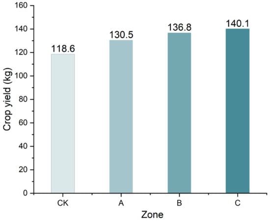 According to Figure 8, the yield of Sesbania is ranked in descending order as follows: Zone C > Zone B > Zone A > Control group. The yield in Zone A, Zone B, and Zone C (the subsurface drain spacing of the three experimental areas was 15 m, 11 m, and 6 m, respectively) increased by 10.0%, 15.3%, and 18.1%, respectively, compared to the control group. Additionally, the yields in Zone B and Zone C increased by 4.8% and 7.4%, respectively, compared to Zone A. The yield in the experimental area with a subsurface drain spacing of 6 m increased by 4.8% compared to the experimental area with a subsurface drain spacing of 11 m. It can be observed that the subsurface drainage areas have significantly higher yields, with increases of more than 10% compared to the control area. However, the yield differences among the 15 m, 11 m, and 6 m spacing areas are relatively insignificant. The experimental results show that subsurface drainage has a significant impact on the yield of Sesbania compared to natural drainage. Compared to the control group, all three experimental areas with different subsurface drain spacings showed an increase in crop yield of over 10%. However, the yield differences among the different subsurface drain spacing experimental areas were not significant. The results of the ANOVA indicated that the effect of drainage pipe spacing on the yield of a salt-tolerant crop was significant (p < 0.05).