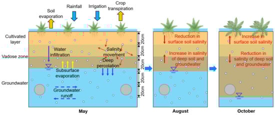 According to the salt transport principle (Figure 9), after leaching, surface soil salt penetrates into deeper soil layers or groundwater and is then discharged through the drainage system. The movement of salt in the soil is primarily influenced by changes in moisture content. The subsurface drainage system, such as a buried pipe system, provides a pathway for water movement in agricultural fields. As the spacing between underground drainage pipes increases, the drainage capacity of the pipes decreases [37,38]. This is because smaller pipe spacing and shallower burial depth result in a higher hydraulic gradient and greater water infiltration intensity, leading to more pronounced flow convergence. Consequently, the migration distance of salt decreases, and the desalination rate increases. Salt continuously accumulates in the subsurface drainage pipes and is subsequently discharged, resulting in better desalination effects. Therefore, based on our research, we recommend adopting optimal parameters for subsurface drainage design, including a pipe spacing of 6 m and a burial depth of 40 cm for the drainage outlets.