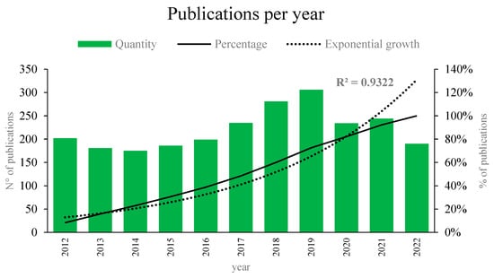 Considering that scientific publications quickly become outdated, research in the framework of green chemistry is increasing, as shown in Figure 2. This field of research has high potential. From 2020 to 2022, the research output decreased slightly, possibly due to the novel coronavirus disease 2019 (COVID-19) pandemic during this period, when many universities and research centres were forced to interrupt their work. Yet, despite this adversity, the publications continued to share knowledge under the guidelines of green chemistry [55].