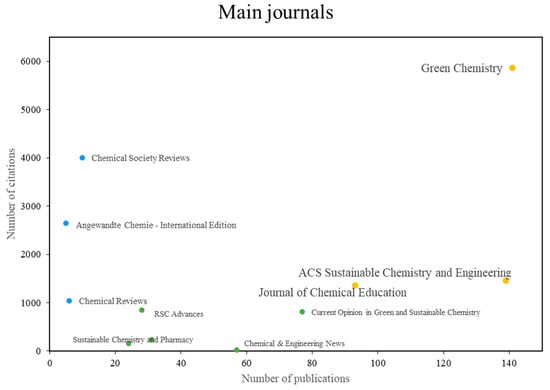 Figure 3 presents the analysis of journals that serve as research benchmarks in the scientific production of green chemistry based on publication quantity evaluation as an indicator of scientific productivity and citation count as an index of academic impact. However, it should be noted that high-impact publications may be identified based on their high citation counts due to the topic’s novelty. Consequently, researchers may be more interested in the metric itself than the actual research. Conversely, a low number of citations does not necessarily imply poor quality or a weak contribution to science [56].