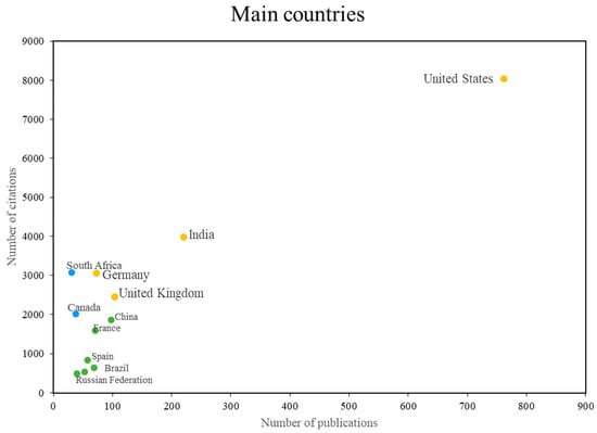 Furthermore, this bibliometric analysis evaluates aspects associated with scientific productivity and academic impact on a global scale, specifically examining the countries that have led the scientific development of green chemistry, as depicted in Figure 4. The United States has made the most significant contribution to scientific knowledge, producing the highest number of articles (762), which accounts for approximately 35% of the scientific literature. Consequently, the United States also has the highest scientific impact, receiving the most citations. This underscores the importance of the American knowledge base and its influence on the current state of the literature on green chemistry.
