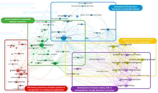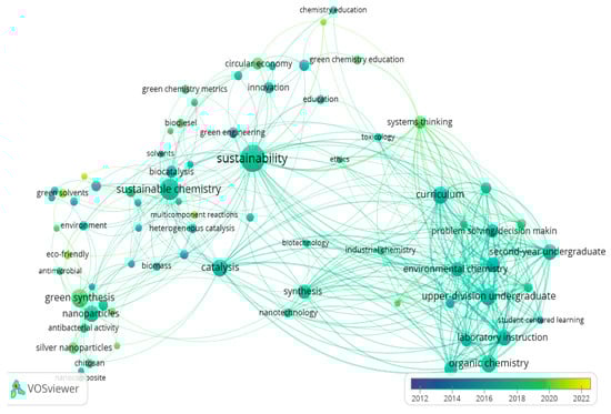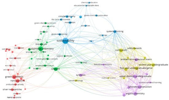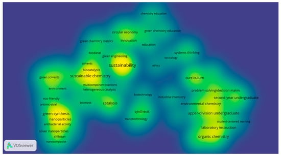 Figure 9 visually represents the green chemistry keyword density. The density is determined by the colour and area of the nodes; that is, the higher the keyword colour intensity and amplitude are, the higher the number of studies that include the keyword. Conversely, when the colour is light and the amplitude is small, the number of studies that include the keyword is limited. Four trends in green chemistry research were detected: sustainability, sustainable chemistry, green synthesis, and upper-division undergraduate. Sustainability research trends are motivated by the UN 2030 agenda, proposed in 2015 [58,59], towards a gradual transition to environmentally friendly methods, technologies, and procedures in which sustainable chemistry and green synthesis are closely associated from different industrial and educational perspectives.