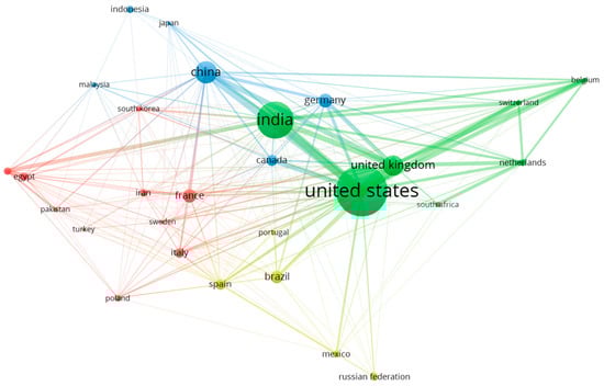 On the other hand, in terms of the structural analysis of international scientific collaboration, Figure 10 presents the main co-authorship network among countries. In this regard, it is evident that the primary cluster of scientific cooperation is characterised by the colour green, which includes some of the most productive countries (see Figure 4), with a notable emphasis on the relationship between the United States and India.