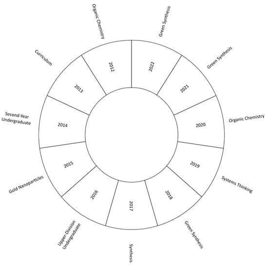 Figure 11 shows the most used keywords by year during the study period. In 2012, the most used keyword was organic chemistry. Although organic chemistry lost importance in the following years, interest in this keyword resumed in 2020, thus highlighting the motivation to integrate the principles of green chemistry from undergraduate education to analytical laboratory practices [65]. Even social justice issues have been incorporated into the organic chemistry curriculum to address the history, social, cultural, and environmental impact of compounds, predicting products, and functional groups [66]. In 2013 and 2014, the most used keywords were curriculum and second-year undergraduate. These results highlight the interest in strengthening undergraduate study curricula by including metric disciplines such as chemometrics [67] and designing undergraduate courses aimed at changing attitudes and fostering critical thinking [68,69] towards setting hazard criteria for chemical products and inputs within the framework of the principles of green chemistry.