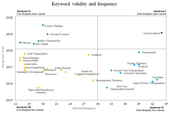 Quadrant IV shows more frequent but less current terms, such as curriculum. Research on this topic aims at improving the design of study curricula by introducing specific courses to help students move from the laboratory to the real world and strengthen their skills and awareness in the field of green chemistry [98]. In this context, research regarding the upper undergraduate division shows the need to educate a new generation of highly motivated and responsible scientists to implement the principles of green chemistry and a substantial approach to sustainable development [99]. Other terms found in this quadrant are organic chemistry and laboratory instruction, both of which have strong links complementing each other from theoretical to practical domains. Research on synthesis applying the fundamentals of nanotechnology and catalysis opens up new opportunities [100] in the formative stages of students efforts towards raising green awareness and promoting sustainability thinking and reasoning [101].
