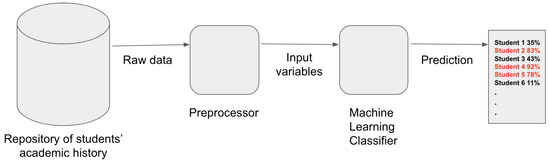 In other words, the problem addressed in our study is to determine the function f, where , that maps the input variables from the academic record to the target variable, utilizing the provided training dataset. To tackle this challenge, we have chosen a supervised learning approach, specifically employing classification methods.