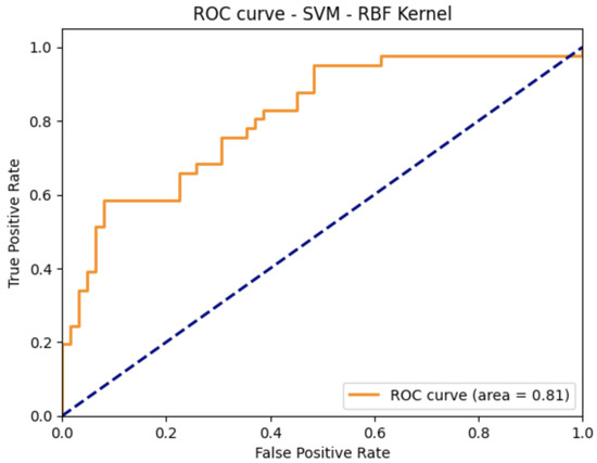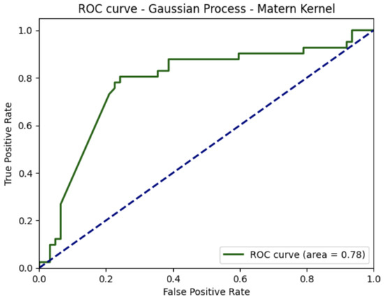 In addition to the evaluation of the methods regarding accuracy, precision, recall, and harmonic mean (), as presented in Table 1, Table 2, Table 3 and Table 4, respectively, we conducted a further analysis of the receiver operating characteristic (ROC) curves for both GP with the Matern kernel and SVM with the radial basis function kernel, as depicted in Figure 3 and Figure 4, respectively. The area under the ROC curve (AUC) for GP with the Matern kernel was found to be 0.78, indicating that this classifier performed significantly better than random guessing and provided a good level of discrimination between positive and negative instances. Furthermore, Figure 4 demonstrates that the SVM with the radial basis function kernel had a greater AUC compared to GP with the Matern kernel.