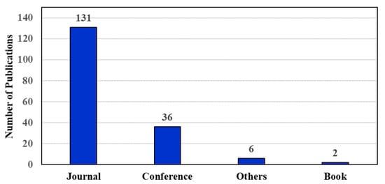We defined various related keywords and search criteria, as shown in Table 1, and then we carried out an intensive search in the chosen databases. We used various combinations of related terms and ended up with more than 60,000 documents, including duplicates. After limiting the search to the title and abstract and removing duplicates, we found around 2000 publications. We conducted a detailed screening to remove irrelevant documents and augmented the remaining ones with some papers manually found to provide an overview of related technologies and machine learning approaches. The final list had 175 publications, which were distributed over various years, as shown in Figure 1, and of various types, as shown in Figure 2. We then analyzed the distribution of included references under each of the categories in Table 1 and the results are shown in Table 2 and Figure 3.