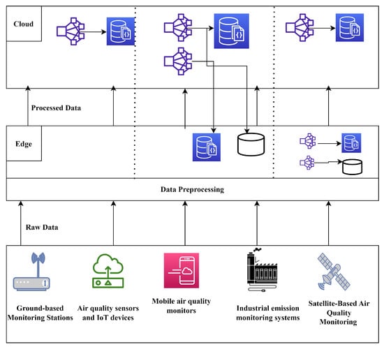 The rise of edge computing and edge intelligence has stimulated advancements in air quality monitoring and forecasting [4,48]. Edge computing offers several operational advantages [47,49]. Primarily, it brings data processing and analysis closer to the source of data generation, bypassing the need for centralized cloud servers. This proximity aids in producing real-time insights into air quality, enhancing the efficiency of environmental monitoring [50,51,52]. As illustrated in Figure 4, data collection encompasses a variety of sources, such as stationary and mobile air quality IoT sensors, meteorological stations, satellite remote sensing (https://airquality.gsfc.nasa.gov/ (accessed on 25 January 2023)), and social media platforms [53,54,55,56,57,58]. These sources offer a plethora of information related to air quality, the spatial distribution of greenhouse gases, and the factors influencing air quality, such as traffic flow, meteorological conditions, and human activities [47,59]. However, edge computing also brings new challenges for data collection, integration, and management due to the heterogeneity of sensing devices used to measure the various types of pollutants and the related social, meteorological, and ambient conditions. Depending on the ultimate objective and budget, data can be sampled at different locations and in different time periods with a sensing system deployed with high density [60].