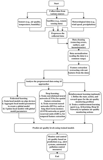 Flowchart for collecting, preprocessing, analyzing, and predicting air quality data using edge computing and AI approaches.