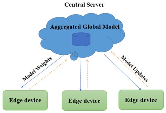 Federated Learning (FL) has begun to reshape the landscape of decentralized machine learning, demonstrating applicability to air quality monitoring [82,83]. The profound potential of this approach stems from its capacity to draw upon distributed datasets while preserving data privacy and optimizing computational efficiency. Developments in the federated learning space have been marked by various distinct approaches. Figure 6 graphically outlines the federated learning approach. This visual representation shows a central cloud server around which numerous local devices, such as IoT sensors and smartphones, are spread out. Arrows depict the flow of information from the cloud server to the local devices and vice versa. The server maintains a global model and at each round shares the model with candidate clients, which in turn use their local data to update the model. The model’s updates from different clients are sent back to the server to be aggregated and incorporated into the global model [70,83].