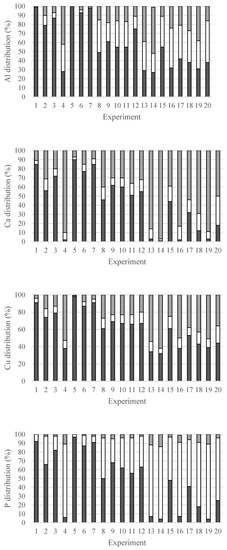 Supplementary Materials (Section S2) as the final pH of the SSA (which ranged from 2.5 to 5.3), the dissolved mass of SSA (7–51%), and the percentwise distribution of the five investigated chemical elements (Al, Ca, P, Cu, and Zn). The percentwise distributions in the 20 2C-ED experiments are shown in