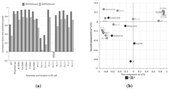 Figure 3b) relates the experimental variables and the responses. The pH and the percentages in the SSA were placed closely together, showing that the lower the pH, the lower the quantity of the measured elements were left in the SSA. As expected, the percentages of all the elements in the catholyte and P in the dispersion solution were placed directly opposite the elements remaining in the SSA.