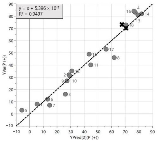 Figure 4 shows the predicted (YPred) vs. the measured (YVar) percentage of P in the dispersion solution. The two additional experiments 19 and 20 (