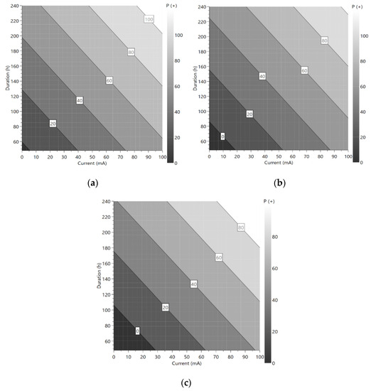 It is interesting when considering the most efficient use of the applied current and future plant design to explore further the differences in treating the SSA at a high or low L:S. For this purpose, three contour plots were constructed with different L:S (7, 10, and 14) showing the extracted percentages in the duration–current space with the same stirring rate (250 rpm) (