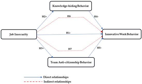 When an individual feels insecure in his job, his anxiety and fear about his future career in the organization increases. In this case, the individual resorts to hiding their knowledge to preserve his job, which may lead to a decline in innovation behaviors in the workplace [18]. Increasing work pressures may also lead to employees feeling insecure, which is reflected in an increase in negative behaviors and practices at work, such as workplace bullying, workplace rudeness, and hiding knowledge. These negative behaviors and practices are reflected in a decrease in innovative work behaviors [13]. Additionally, the employees’ awareness of the possibility of being fired from work as a result of the policies applied by the organization leads to the unwillingness of those employees to share their knowledge and ideas, which is reflected in their unwillingness to create and implement innovative ideas, as well as the spread of negative behaviors at work [75]. Jeong et al. [60] indicated that an individual’s feeling of job insecurity links with a large number of behaviors and practices in the workplace, such as low organizational voice behaviors, and knowledge sharing. They highlighted that the individual’s tendency not to share knowledge, which is the basis for developing work, products, and services, negatively affects innovative ideas generation for improving performing tasks and providing distinctive products and services. Shoss et al. [19] added that the employees’ sense of job insecurity leads to weak innovative work behavior as a result of employees’ low well-being, engaging in deviant behaviors, anti-productive work behaviors, and a lack of desire to share knowledge with managers or colleagues. Therefore, the following hypothesis is suggested: