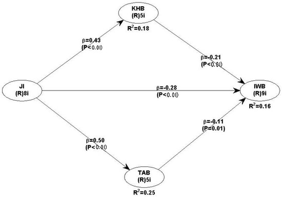 Table 8 shows the bootstrapping analysis and illustrates that the indirect impact’s Std. β = −0.090 (0.430*−0.210) was significant with a t-value of −2.736. Moreover, the indirect impact of −0.090, 95% bootstrapped confidence interval: (LL= −0.155, UL= −0.026), does not straddle a 0 in the middle, confirming mediation. As a result, the mediation effect of KHB in the relationship between JI and IWB is considered statistically significant. As a result, H6 is supported. However, for the mediating role of TAB, zero crosses in between a 95% bootstrapped confidence interval: (LL= −0.120, UL= 0.010). Thus, the mediation effect of TAB in the relationship between JI and IWB is statistically insignificant. Therefore, H7 is rejected.