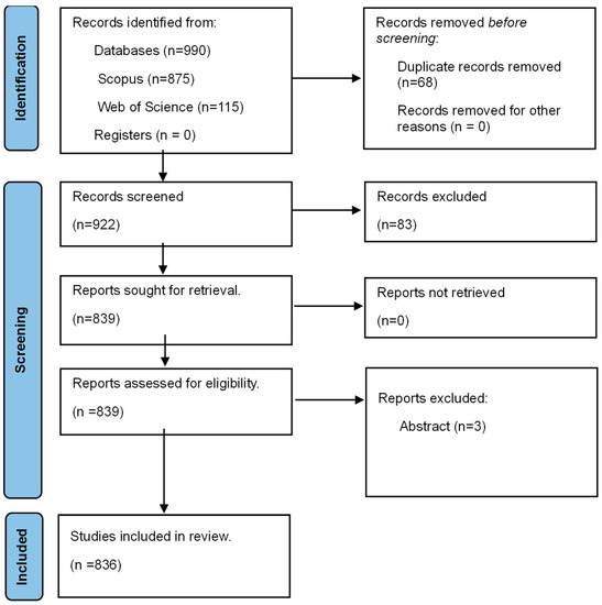 A total of 115 and 875 records were retrieved from Web of Science and Scopus, respectively. The records were downloaded into Microsoft Excel templates and then merged by terms with the respective application of the defined exclusion criteria. A single merged database containing 836 records was obtained, serving as the necessary input for the beginning of the bibliometric analysis. For processing the information to obtain quantity and quality data, predesigned Microsoft Excel and VOSviewer macros were used, allowing the visualization of multiple maps, such as the co-occurrence of keywords, co-authorship, citations and co-citations based on bibliographic data, revealing the productivity, impact and connectivity between authors [41]. Figure 1 is a flow chart of this study designed based on the PRISMA 2020 statement, accounting for all the steps in the methodological design used.