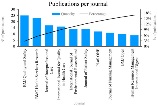 Figure 3 shows the 10 most productive journals, which account for 16.74% of the publications, with BMJ Quality and Safety leading with 25 publications, equivalent to 2.77% of the total, followed by BMC Health Services Research, with a contribution of 2.54% of all publications, and Journal of Interprofessional Care, accounting for 1.88% of all publications. The percentages calculated for the three most productive journals allow the conclusion that the information is not centralized in a select group of journals but rather in a wide variety of journals that have an interest in the subject; for example, 25.09% of journals published 371 articles, while 72.79% of journals published 380 articles.