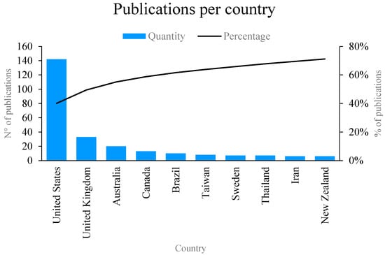 Figure 4 shows the 10 countries with the most publications related to research on organizational culture and teamwork, representing approximately 70% of the scientific body. The United States stands out as the most productive country, accounting for 39.41%, followed by the United Kingdom and Australia, which account for 9.41% and 5.46%, respectively. This can be explained by the interest exhibited by researchers in recent decades, where a diversity of dimensions and attributes have been proposed to analyze organizational culture. Within these dimensions and attributes are gender equality initiatives, which are used to rank the commitment of organizations to social justice [49]; methods to measure organizational culture based on identifying values and practices that increase organizational risk [50]; and the constant digitization of society and organizations, motivating research to redefine the strategies and routing of organizational culture [51].